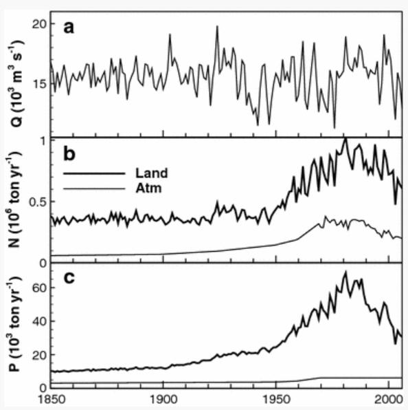 Kuva 2 Keskimääräinen N- ja P-kuormitus (103 tonnia/v) Itämereen maalta ja ilmasta 1850-luvulta alkaen (Gustafsson ym. 2012) [4] .