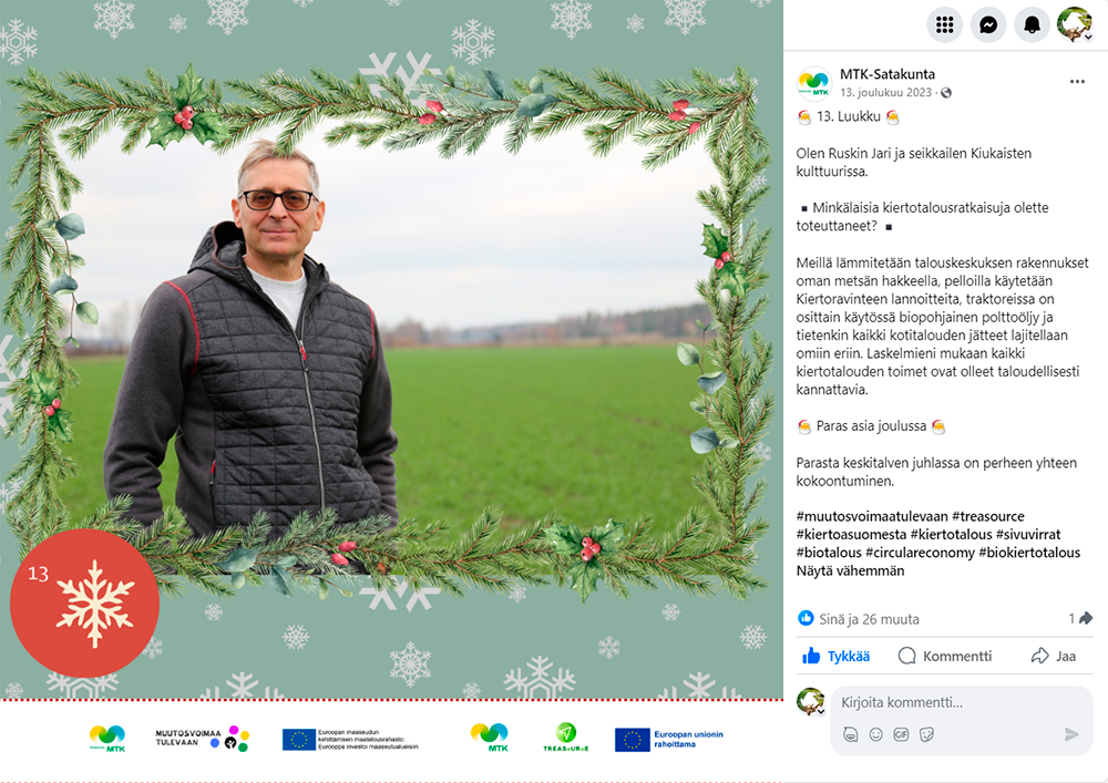 Joulukuussa julkaistussa MTK:n kiertotalouskalenterissa esiintyi 22 innovatiivista viljelijää, jotka jakoivat tarinoitaan ja kokemuksiaan kiertotaloustoimista tiloillaan. Tämä ainutlaatuinen kalenteri toi konkreettisia esimerkkejä kiertotaloudesta samalla levittäen joulumieltä ja ympäristötietoisuutta. Kalenterin luomisessa olivat mukana MTK-Satakunnan Muutosvoimaa tulevaan -hanke ja MTK Keskusliiton TREASoURcE-hanke.