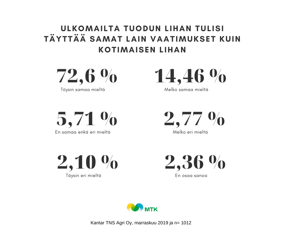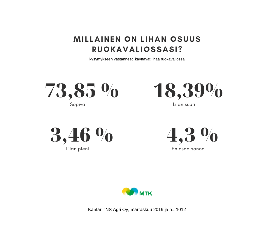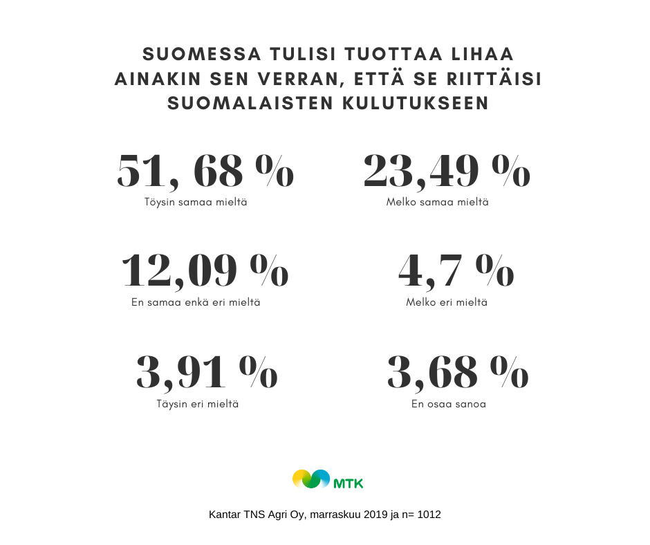 Maa- ja metsätaloustuottajain Keskusliitto MTK teetti Kantar TNS Agri Oy:llä kyselyn suomalaisten näkemyksistä lihan tuotantoa ja kulutusta kohtaan. Tuoreen kyselyn mukaan lihan asema suomalaisten ruokapöydissä on melko vakaa. Suomalaisista yli 80 prosenttia syö lihaa vähintään kerran viikossa. Kolme neljästä suomalaisesta on täysin tai melko samaa mieltä siitä, että kotimaista lihaa tulisi tuottaa vähintään suomalaisten kulutusta vastaava määrä.
