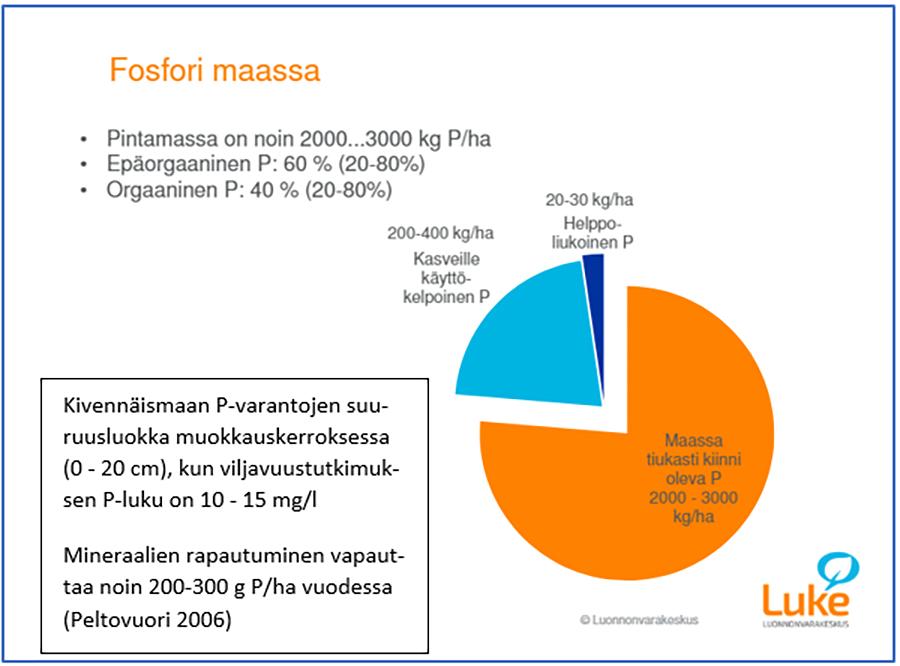 Suomen maaperässä on luonnostaan niukasti kasveille käyttökelpoista fosforia (P), mutta lannoitteista on kertynyt viljelymaahan jopa 1 000 kg P/ha. Kivennäismaiden P-varoista keskimäärin 70 % on kivennäisaineksessa ja 30 % orgaanisessa aineessa.