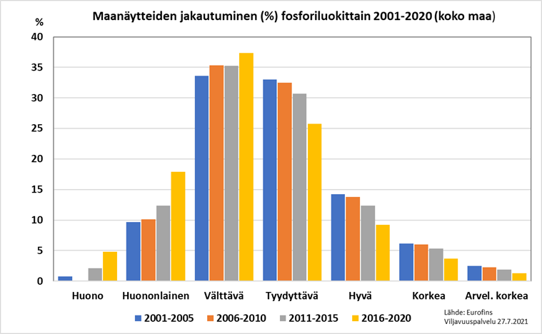 Luke on koonnut viljavuustietoja viljavuusanalyysejä tekeviltä laboratorioilta neljältä ajanjaksolta: 1996–2000, 2005–2009, 2010–2014 ja 2015–2019 (Lemola ym. 2023). Korkeiden P-lukujen osuus on vähentynyt selvästi ajan kuluessa. Koko maan pelloista 3 korkeimman P-luokan osuus oli ensimmäisellä jaksolla noin 28 % ja viimeisenä jaksona 17 %. Keskimmäisten luokkien osuus on koko maan tasolla pysynyt tasaisesti 64–65 %:ssa maanäytteistä kaikilla jaksoilla. Kahden alimman luokan osuus on kasvanut ensimmäisen jakson 7 %:sta neljännen jakson noin 19 %:iin. Peltomaiden keskimääräinen P-pitoisuus on laskenut 20 vuodessa aikana 26 % (v. 1996–2000 keskim. 14,5 mg/l ja v. 2015–2019 keskim. 10,7 mg/l).