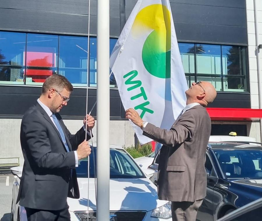 MTK:n valtuuskunnan puheenjohtaja Eerikki Viljanen ja metsävaltuuskunnan puheenjohtaja Mikko Tiirola nostivat Suomen ja MTK:n liput salkoon ennen kokouksen alkua.