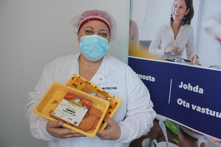 Kirsi Nummela työskentelee lihantarkastajana ja työntekijöiden varapääluottamusmiehenä HKScanin Rauman yksikössä, jossa valmistettuja kotimaisia broilerituotteita on tarjolla myös kuntakeittiöissä.