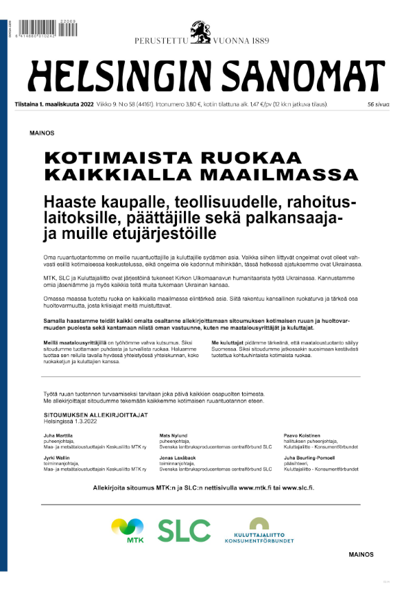 Oma ruuantuotantomme on meille ruuantuottajille ja kuluttajille sydämen asia. Vaikka siihen liittyvät ongelmat ovat olleet vahvasti esillä kotimaisessa keskustelussa, eikä ongelma ole kadonnut mihinkään, tässä hetkessä ajatuksemme ovat Ukrainassa.