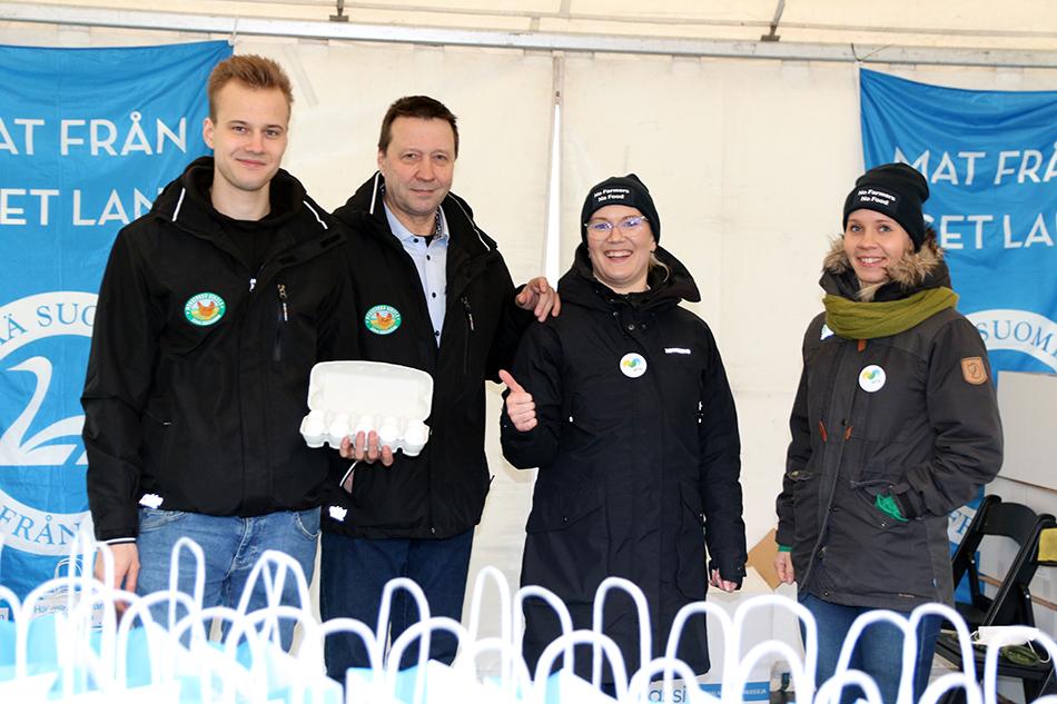 Vasemmalta Patrik Nikula ja Jukka Nikula Munatukku Oy:stä sekä MTK:n asiantuntijat Mari Lukkariniemi ja Saara Patama. Munatukku Nikulan perheyritys oli paikan päällä myymässä kananmunia.