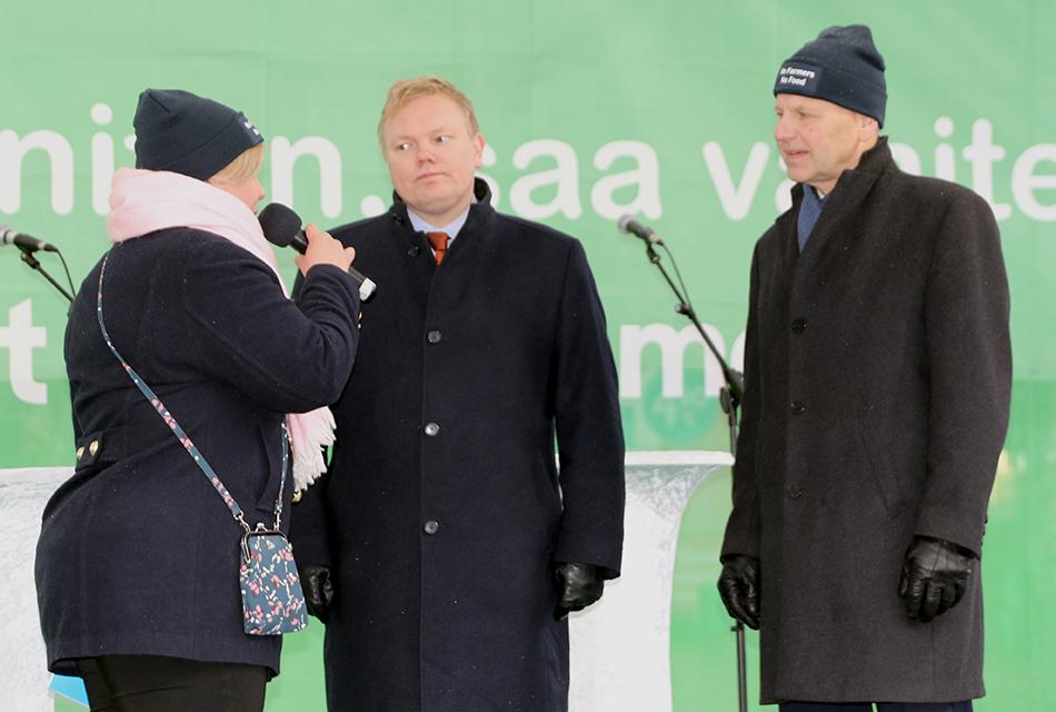 Maa- ja metsätalousministeri Jari Leppä ja tiede- ja kulttuuriministeri Jari Leppä pistäytyivät tapahtumassa myös antamassa tukensa viljelijöille. Ministereitä haastattelee MTK:n ruokamarkkina-asiantuntija Heidi Siivonen.