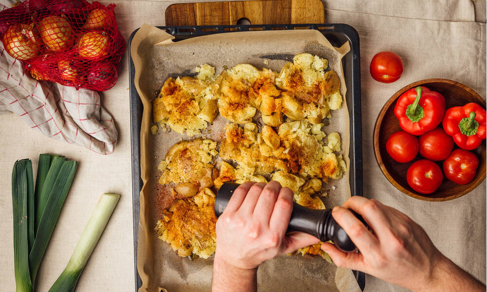 - Sivele litistetyt perunat rypsiöljyllä ja mausta suolalla, mustapippurilla sekä paprikajauheella. Paahda 225 °C uunissa 15 minuuttia. Ripottele juustoraaste päälle ja paista vielä 5–7 minuuttia, kunnes juusto sulaa ja saa hieman väriä.