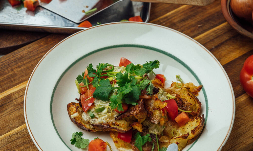 - Nosta uunista paistetut perunat tarjoiluvadille tai pidä ne pellillä. Lusikoi päälle lämmin smetana-purjotäyte. Ripottele pinnalle tuoretta hienonnettua purjoa, paprikakuutioita, tomaattikuutioita ja korianteria.