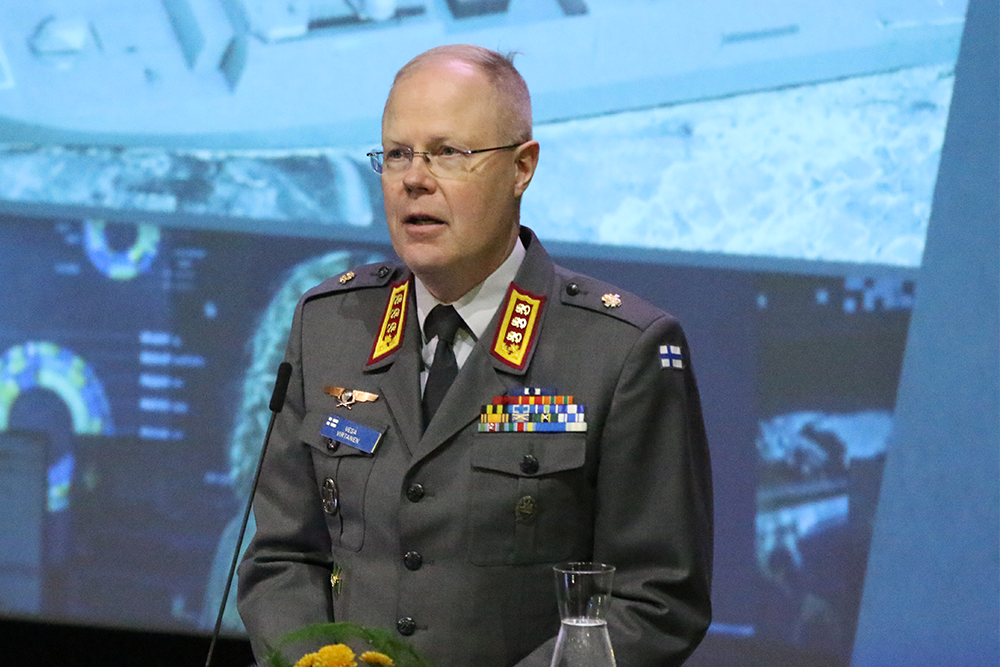 Kenraali Vesa Virtanen pääesikunnasta piti alustuksen kokonaisturvallisuudesta ja turvallisuusympäristön muutoksesta.