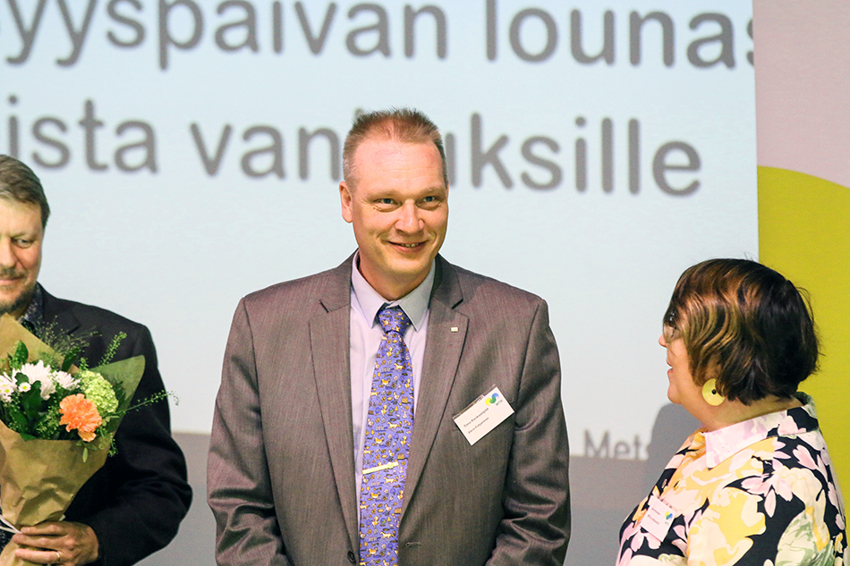Palkinnot luovuttivat Helmityöryhmän puheenjohtaja Kati Partanen ja työryhmän jäsen Pekka Kärkäs