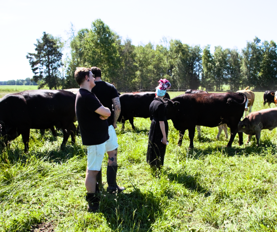 Vuoden Kokki 2023 -kilpailussa kolmanneksi sijoittunut Simo Harrivaara, Vuoden kokki 2023 Johan Kurkela ja Vuoden tarjoilija 2023 Kirsi Seppänen tutustumassa Hirvilammen tilan nautoihin kesällä 2024.