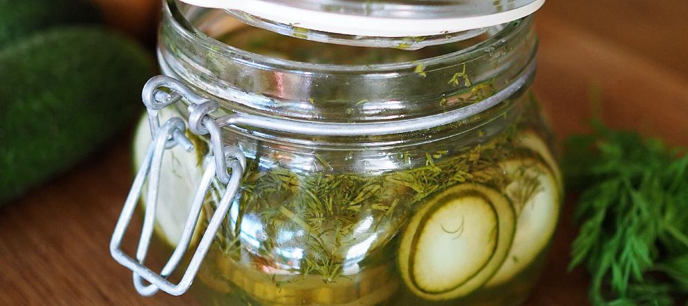 Huuhtele kurkut ja viipaloi ne ohuiksi. Hienonna tilli. Lisää kaikki raaka-aineet kannelliseen purkkiin ja hölskytä sekaisin. Anna maustua vähintään 30 min jääkaapissa ennen tarjoilua.