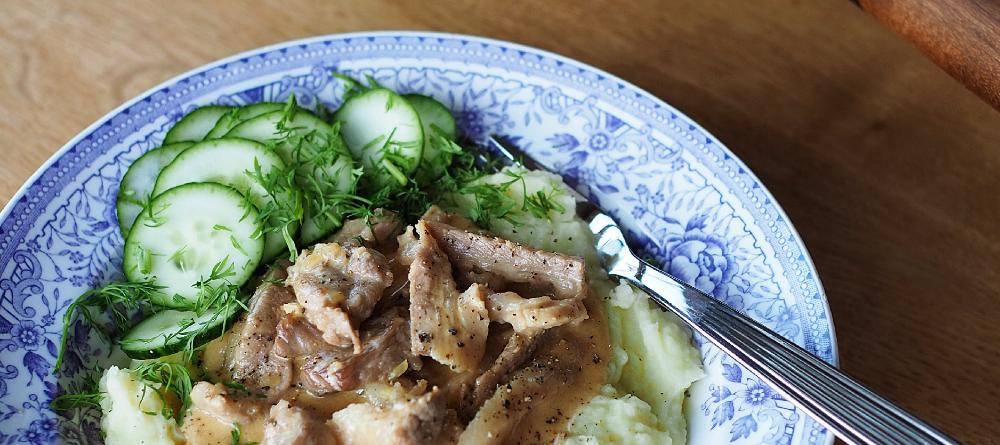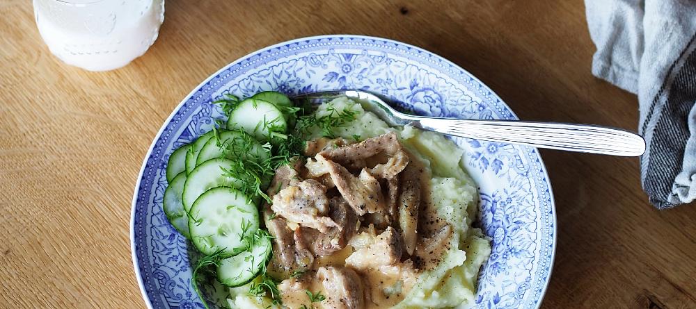 Leikkaa possunkylki ohuiksi suikaleiksi. Kuumenna pannulla voi. Kuullosta hiennonnettu sipuli voissa ja lisää liha joukkoon. Paista pinnat kiinni. Lisää kerma sekä mausteet, kiehauta kasaan n. 5 min ja anna porista tämän jälkeen miedolla lämmöllä n. 10 min. Tarjoile perunamuusin ja mummonkurkkujen kanssa.